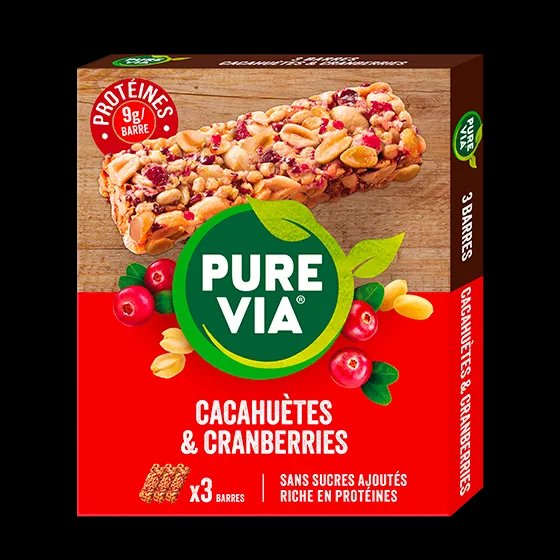 Savourez nos Barres de Céréales Pure Via® sans sucres ajoutés, élaborées avec des ingrédients de qualité associant le croquant des cacahuètes grillées au goût acidulé des cranberries.