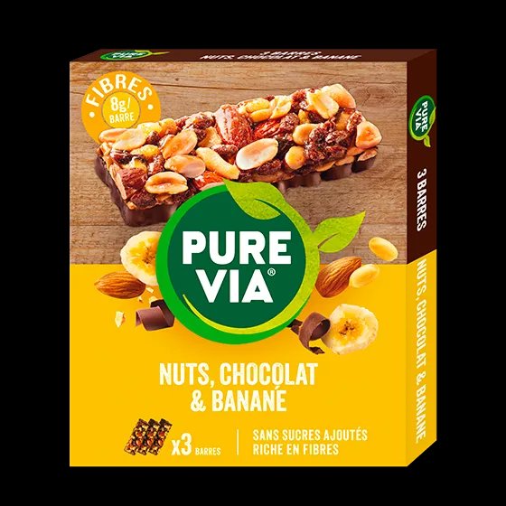 Savourez nos Barres de Céréales Pure Via® sans sucres ajoutés, élaborées avec des ingrédients de qualité associant le croquant des cacahuètes grillées à la gourmandise du chocolat et de la banane.