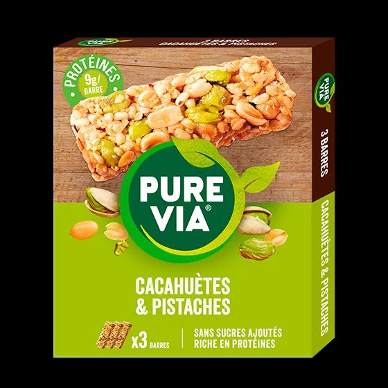 Savourez nos Barres de Céréales Pure Via® sans sucres ajoutés, élaborées avec des ingrédients de qualité associant le croquant des cacahuètes grillées à la douceur de la pistache.