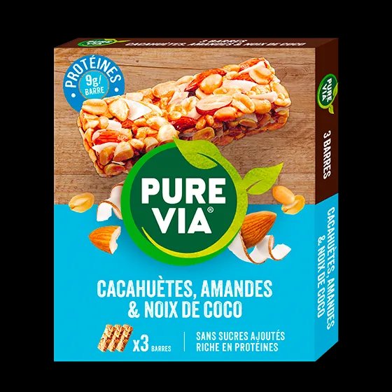 Savourez nos Barres de Céréales Pure Via® sans sucres ajoutés, élaborées avec des ingrédients de qualité associant le croquant des amandes grillées à la note exotique de la noix de coco.