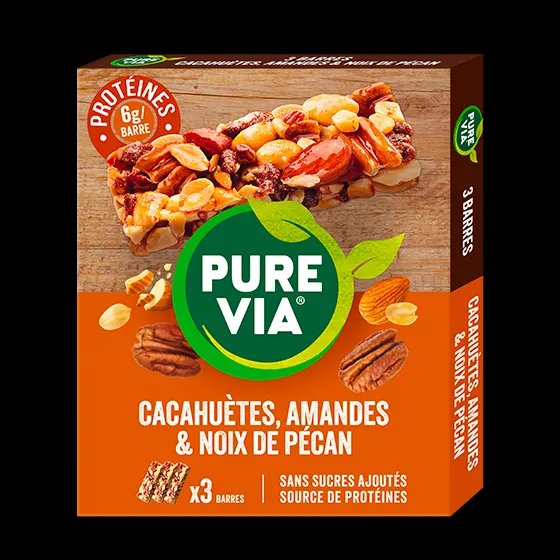 Savourez nos Barres de Céréales Pure Via® sans sucres ajoutés, élaborées avec des ingrédients de qualité associant le croquant des cacahuètes et des amandes grillées à la saveur intense des noix de pécan.
