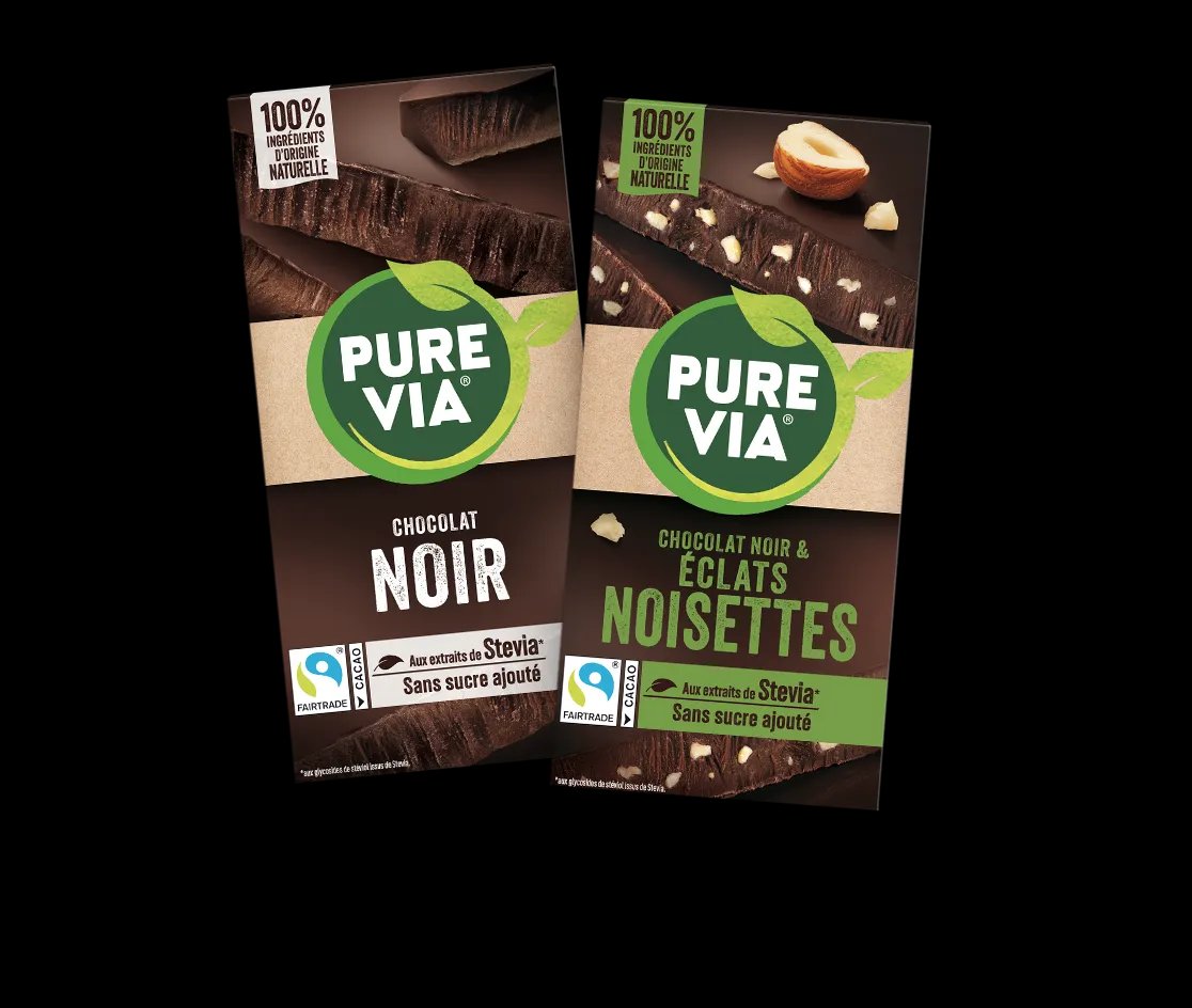 Pure Via ® a choisi pour vous des ingrédients de qualité pour élaborer sa gamme de chocolats sans sucre ajouté ! Elles sont principalement produites à partir d’ingrédients d’origine naturelle sélectionnés avec soin, comme son cacao certifié Fairtrade.